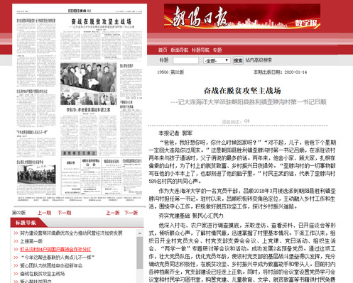 1月14日,《朝阳日报》在第二版以“奋战在脱贫攻坚主战场”为题,报道了我校派驻朝阳县胜利镇第一书记吕顺的扶贫工作事迹。