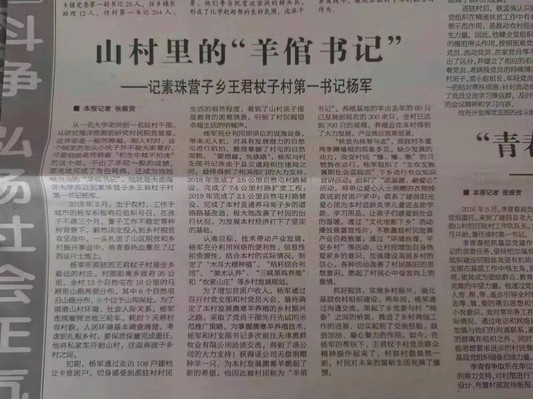 1月6日,《葫芦岛日报》在选派干部专版头条以“山村里的‘羊倌书记’”为题,报道了我校派驻建昌县素珠营子乡王君杖子村第一书记杨军同志的扶贫工作事迹。