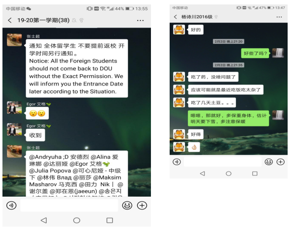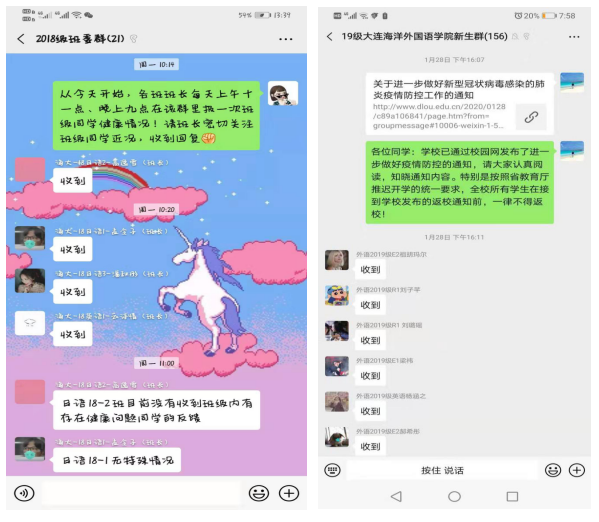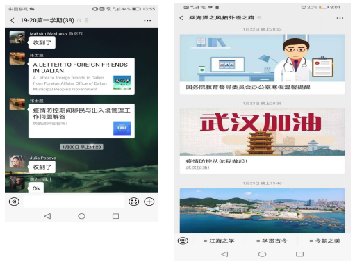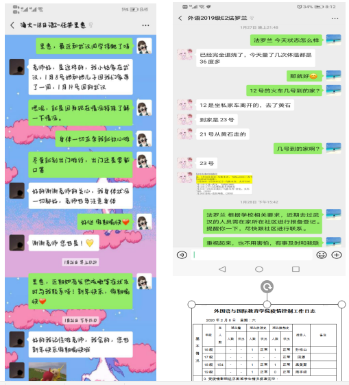 疫情期间,按照学校有关要求,外国语与国际教育学院严格执行疫情排查日报告、零报告制度,学院学生工作队伍对近期有湖北旅游史及湖北接触史的同学、驻连学生的信息等,进行“一对一”了解,坚持“一日一报”,让学生每日进行健康打卡,并做好“疫情控制工作日志”, 认真统计上报各类学生数据。