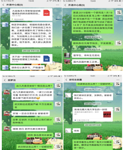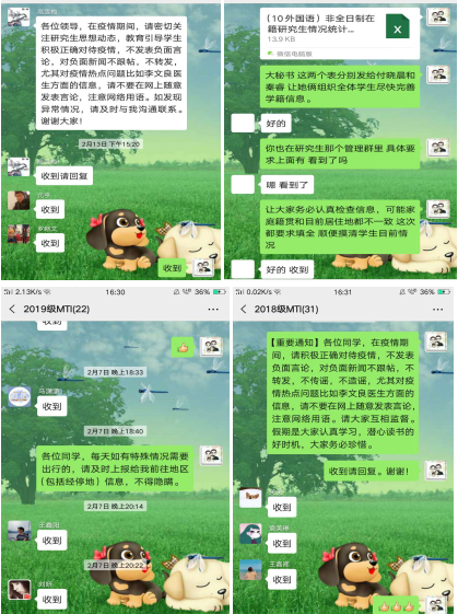外国语与国际教育学院党政领导加强组织,负责研究生工作的副书记、辅导员具体落实,坚持实行“日报告”“零报告”制度,重点关注两位武汉籍贯研究生的生活动态,及时传达校党委和研究生院的通知要求,确保防控工作万无一失。