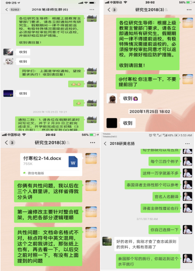 疫情期间,研究生导师充分发挥第一责任人的作用,及时督促学生“停课不停学”,树立自主学习和自律意识,例如:督促2018级研究生完成15万字的翻译量和毕业论文撰写,并在线为研究生答疑;督促2019级研究生每天落实翻译任务量,利用寒假积极准备翻译资格证书考试等。