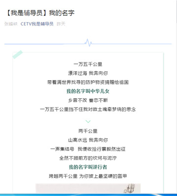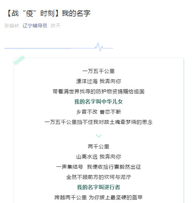 在全国上下众志成城抗击新冠肺炎之际,高校辅导员始终默默地奋斗在防控疫情第一线,践行初心使命共同守护学生生命安全和身体健康。我校开展了“辅导员有话对你说”活动,辅导员通过撰写寄语、视频送祝福、同唱大国大爱、诗朗诵、好书推荐等方式,传递对学生的牵挂,寄去远方的叮咛和嘱托。其中应用技术学院辅导员张峰峡言为心声、以诗明志,潜心创作诗词《我的名字》被中国教育电视台《我是辅导员》栏目和《辽宁辅导员》两大媒体平台转载推送,赢得广泛好评。