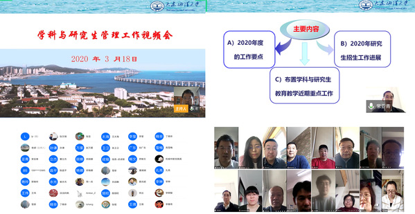 会议要求,疫情期间,研究生教育各项工作要稳步推进,确保良好的工作秩序。要认真做好研究生招生工作,科学制定扩大研究生招生计划方案;要严格招生纪律,根据疫情发展合理推进招生调剂与复试工作;要做好疫情防控期间的研究生课程线上教学工作,稳步提高网络课程教学质量;要做好春季毕业研究生学位论文工作,加强研究生与导师的线上沟通,借助网络视频、音频等形式开展预答辩,避免人员集中;要继续做好研究生思想政治教育和就业相关工作,关注研究生身体健康状况、居住地变化、思想动态等动态变化,重点关注返连学生、湖北籍等特殊学生群体以及困难学生的帮扶工作;要加强舆论引导,开展形式多样的爱国主义教育活动;要扎实做好就业工作,组织研究生参加网上招聘会、关注各种就业信息,促进研究生高质量就业;要继续加强研究生教学和就业督导,保障研究生线上课程教学、学位论文和就业各环节的质量,为研究生教育保驾护航。