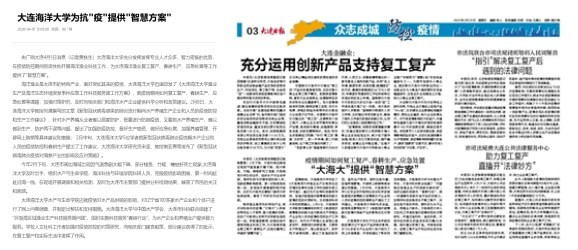 近日,央广网、《大连日报》分别以《大连海洋大学为抗“疫”提供“智慧方案”》《“大海大”提供“智慧方案”》为题报道我校为疫情防控期间复工复产、春耕生产、应急处置等方面建言献策的相关工作。