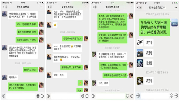 当前,新冠肺炎疫情正在海外蔓延,学校时刻关注着海外师生的健康和安全,多次在会上研究涉外防疫工作,把海外师生的疫情防控纳入学校总体部署,实施网格化管理。为切实掌握师生目前在海外的生活和健康情况,指导师生有效做好个人防护,学校第一时间摸排122名出国境学生和16名出国境教师出入境动态,建立信息台账,设立微信群,联合各学院开展海外师生“日报告”“零报告”工作,及时向学校报备身体状况,分享出行动态。