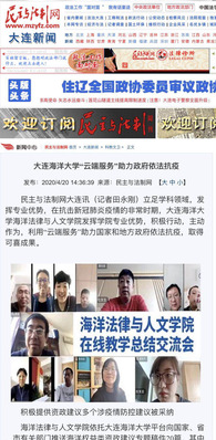 4月20日,民主与法制网以“大连海洋大学‘云端服务’助力政府依法抗疫”为题报道我校海洋法律与人文学院疫情防控期间取得的成果。报道中指出海洋法律与人文学院依托大连海洋大学平台向国家、省、市有关部门推送资政建议,多个涉及疫情防控专题稿件被采纳。 在此期间,海洋法律与人文学院组织师生有针对性的开展科研服务,结合渔业法修改、野生动物保护法修改、生物安全立法开展科学研究,在线上教学全面开展的同时有序开展“云端”科研。目前,已完成9项科研课题、5册书稿撰写完毕、提供资政建议20余条、成功申报国家及省部级科研课题20余项。院长裴兆斌被选为大连市司法局应急法律服务小组成员,他还积极配合农业农村部开展防控疫情专项法治宣传行动,录制了《渔业行政执法与刑事司法衔接》专题课程,为国家疫情防控贡献了力量。