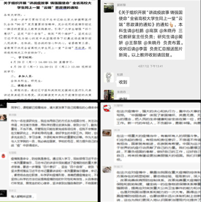 从此次观看总体情况来看,全体研究生118人采用直播或者直播回放的方式观看了此次思政课。其中30人通过直播方式观看,88人通过回放的方式参与了此次思政课的学习。118人当中有79人提交了观看视频,89人提交了心得体会。从研究生提交的心得体会来看,本次“讲战疫故事 铸强国使命”全省高校大学生同上一堂“云端”思政课获得了良好的教育效果。在直播结束后,同学们意犹未尽,在群内发起了积极的讨论,大家都踊跃发言,发表自己的心得、感受。