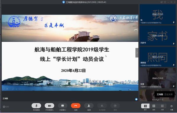 4月22日,航海与船舶工程学院通过“钉钉会议”“腾讯课堂”等平台,组织2019级全体同学相聚“云”端,开展了本学期第一次线上“学长计划”。学院党总支副书记王海鹏、军训教官以及2019级全体学生参加。