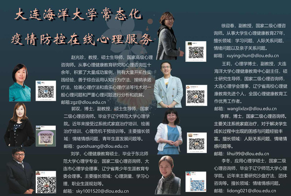 在疫情期间,我校心理健康教育中心迅速组成大连海洋大学防疫心理援助团队,利用公众号、网站、微信、QQ等普及疫情相关防护知识,帮助师生排解心理焦虑、恐惧等情绪。在常态化疫情防控中,防疫心理援助团队积极开展大学生网络心理咨询,有效帮助疫情中遭遇心理困扰的师生恢复心理平衡和正常学习生活。