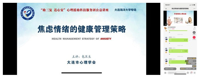5.25心理健康日系列大讲堂活动包括三场在线讲座,分别是我校心理健康教育中心刘学老师主讲的《打开心窗拥抱阳光》在线讲座、大连市心理学会“助三复,送爱心”心理援助科技服务团梁瑛楠博士主讲的《全力以“复”,为“心”赋能——疫情下大学生心理调适》在线讲座、大连市心理学会包春宇医生主讲的《焦虑情绪的健康管理策略》在线讲座。