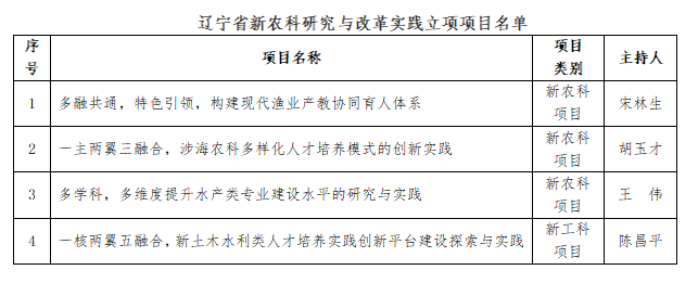 近日,辽宁省教育厅公布了辽宁省新农科、新工科研究与改革实践立项项目名单,我校组织申报的“多融共通,特色引领,构建现代渔业产教协同育人体系”等3个项目获批辽宁省新农科研究与改革实践立项项目,“一核两翼五融合,新土木水利类人才培养实践创新平台建设探索与实践”项目获批辽宁省新工科研究与改革实践立项项目。