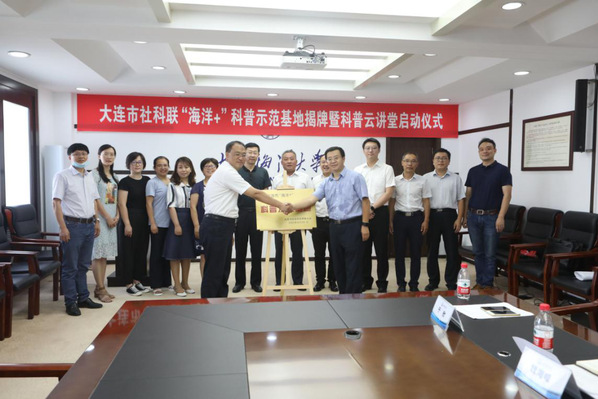 7月17日下午,大连市社科联“海洋+”科普示范基地揭牌暨“海洋+”科普云讲堂启动仪式在行政楼五楼会议室举行。大连市社科联党组成员、副主席邹巍出席会议。大连鑫玉龙海洋生物种业科技股份有限公司、大连富谷海洋食品有限公司等企业负责人参加会议。副校长张国琛出席会议并致辞。水产与生命学院、海洋科技与环境学院、机械与动力学院、航海与船舶工程学院、经济管理学院、海洋法律与人文学院、体育部负责人及科技处相关人员参加了本次仪式。