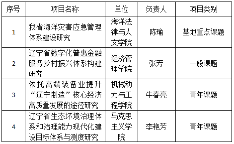近日,辽宁省社会科学界联合会公布了2021年度辽宁省经济社会发展研究课题立项名单。我校共有4项课题获批立项,其中基地重点课题1项,一般课题1项,青年课题2项。