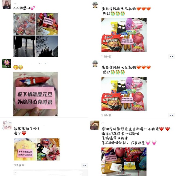 她还承担着校内学院师生生活必须品的采购任务。为保证学生需求,她时常在一天内辗转多个地点配齐物资。学院为了让学生过好元旦,决定为学生配送食品等物资,她和张士超老师在较短的时间内联系供货商,采购了水果、泡面、香肠、榨菜、袜子等生活物资,在元旦之前冒着大雪严寒送到各个校区,将学校的温暖传递给每一个学生。二十多天的时间里,她每天都在处理各种繁杂事务和奔走于各个市场中度过,之前那个柔柔弱弱的女孩子变成了一个 “女汉子”,但她却乐在其中。她说:“抗击疫情,人人有责。看到同事们每天奋战在校内一线,我作为年轻党员,也应为抗击疫情尽职尽责,每当看到学生们收到物资时的笑容,我觉得再累也值得!”同学们感叹到:“老师们辛苦了,这种有求必应的感觉真幸福!”