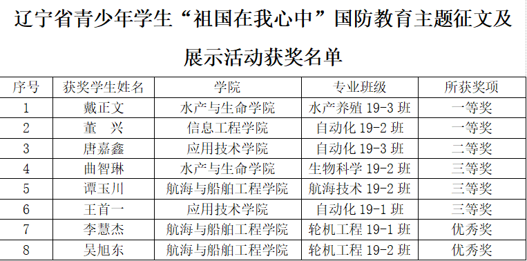 2019年9月至2020年7月,辽宁省国防教育办公室和辽宁省教育厅联合组织开展了辽宁省青少年学生“祖国在我心中”国防教育主题征文活动。我校积极组织学生参与,水产与生命学院戴正文等8名学生在此次比赛中脱颖而出,喜获佳绩。