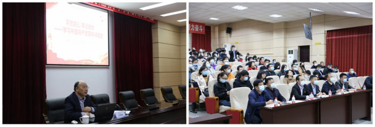 4月14日下午,应用技术学院在主教学楼报告厅举办“建党百年,名家进校”系列活动之第十四期“明志讲坛”。本次活动邀请大连理工大学马克思主义学院院长、教育部哲学类专业、思想政治理论课教学指导委员会委员洪晓楠教授进校,作了题为《不忘初心 牢记使命——学习中国共产党百年辉煌史》的专题报告。院党委委员、领导班子成员、党支部书记、科级干部等180余名党员和师生代表认真聆听了报告。