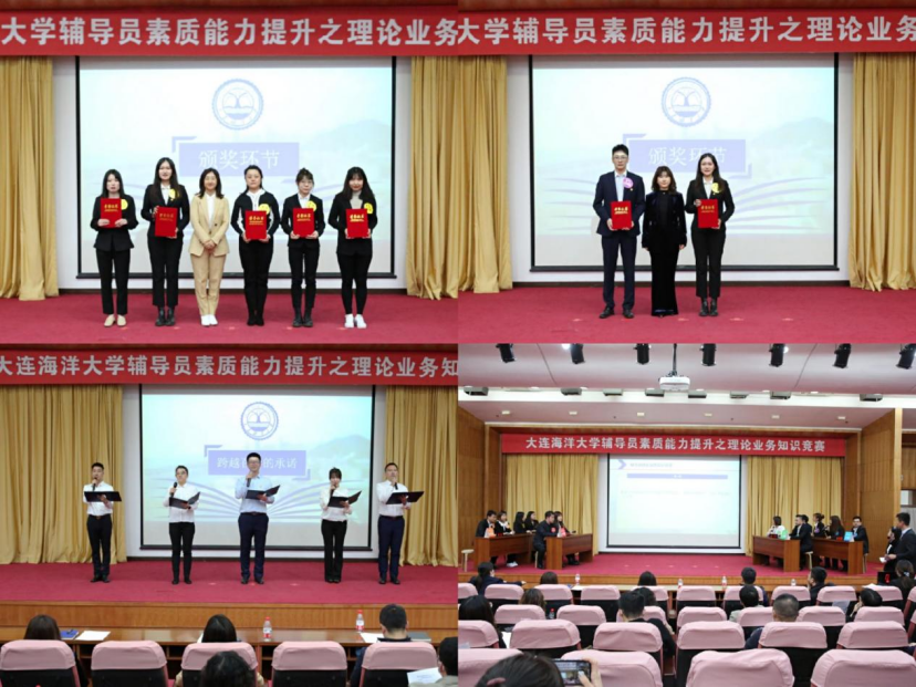 参赛选手被随机分为6组同台竞赛,分别从理论素养和日常管理两个角度考察新入职辅导员的职业能力。参赛选手各尽其能、各显其才,充分展现了自己的理论和业务知识功底。经过必答题、抢答题和风险PK题三个环节的激烈角逐,由水产与生命学院李子玄、海洋科技与环境学院许泽阳、信息工程学院于竺平、海洋法律与人文学院李展、外国语与国际教育学院戴鑫组成的团队荣获一等奖;由海洋科技与环境学院张光耀和吴月阳、航海与船舶工程学院李京和郑淑娟、信息工程学院范晓旭组成的团队荣获二等奖;由水产与生命学院张新、机械与动力工程学院(中新合作学院)李美璇和赵万通、信息工程学院褚广为、经济管理学院鞠春晓组成的团队荣获三等奖。同时,新入职辅导员代表还朗诵了《跨越百年的承诺》,通过诗朗诵为中国共产党百年华诞献礼。