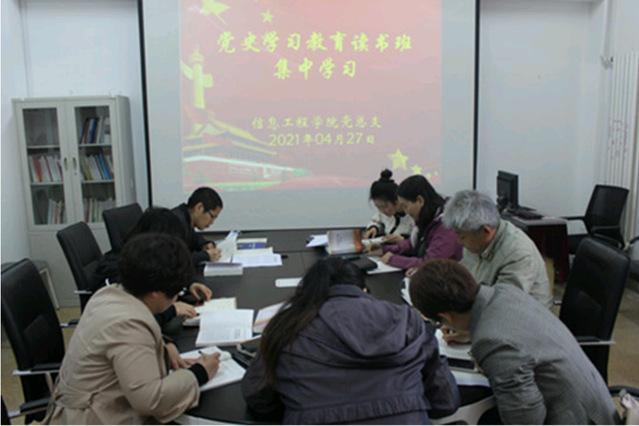 4月27日上午,信息工程学院党总支在学院党员活动室开展了第一期党史学习教育读书班集中学习活动。党总支委员、支部书记参加了此次活动。