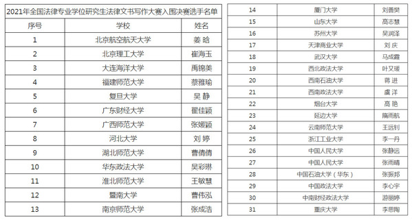 近日,2021年全国法律专业学位研究生法律文书写作大赛决赛入围选手名单公布。经大赛评委会评选,从初赛到复赛,共有来自全国各法律硕士培养单位的31名法律硕士专业学位研究生入围2021年全国法律专业学位研究生法律文书写作大赛决赛。我校海洋法律与人文学院2020级法律(法学)硕士禹锦美成功晋级。
