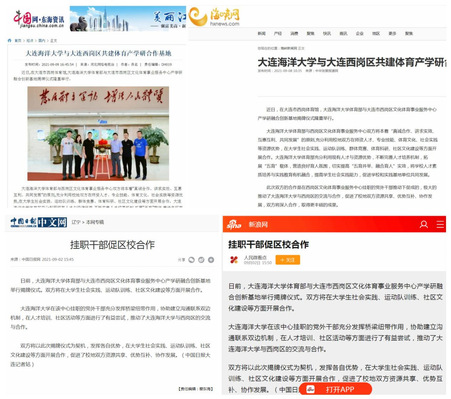 近日,中国网、中国日报网、海峡网、人民微看点等多家媒体以《大连海洋大学与大连西岗区共建体育产学研合作基地》《挂职干部促区校合作》为题报道和转发了我校体育部与大连市西岗区文化体育事业中心共建体育产学研基地。基地的建立有利于区校双方在大学生社会实践、运动队训练、社区文化建设等方面开展合作,促进了区校双方资源共享、优势互补、协作发展。