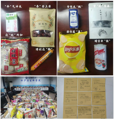 学院还为260名报名2022年研究生考试的同学每人准备了一份特殊的能量补给盲盒。每一份看似普通的礼物都承载了学院对即将“拔剑出鞘”的考研学子的深切眷注和暖心鼓舞。注入了学院老师和学弟学妹满满的期许与祝福,每件礼品都有着一份专属寓意,“薯片:非你莫“薯”、大枣:“枣”日上岸、黑枸杞:紫“杞东来、牛奶:“牛气冲天、火腿肠肠:博采众“肠”、旺旺雪饼:众“旺”所归、纯甄酸奶:梦想成“甄、桂圆莲子八宝粥:蟾宫折“桂。