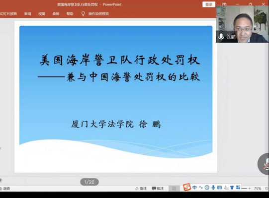 议题二的第五位发言人厦门大学南海研究院徐鹏副教授发言的主题是《美国海岸警卫队行政处罚权探索》。徐鹏详细地比较分析了中美海警在立法中行政处罚权、渔业行政处罚权、海洋环境行政处罚权三个方面共性与差异,包括中美两国行政处罚权在制度化、法典化以及管辖权等方面的比较。