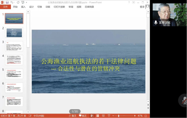 议题一的第三位发言人海南大学傅崐成教授发言的主题是《关于公海渔业巡航执法的若干法律问题》。傅崐成着眼于人类对海洋资源的争夺历史,详细解析了一系列打击IUU捕捞行为的国际协定、双边协议、谅解备忘录,重点言及1995年的《跨界鱼种协定》。傅崐成指出,近年来越来越多的国家展开了打击公海IUU捕捞行为的渔业巡航执法活动,并就这些活动的合法性以及相关法律问题进行了探讨。傅崐成还对公海渔业巡航执法的合法性进行了论证,列出了IUU捕捞行为的两种方式:一为违反沿海国家法令的非法捕鱼;二为违反国际法的非法捕鱼。最后,傅崐成教授对公海渔业船舶管辖权的来源进行阐述,强调了公海上船旗国与沿海国的公海渔业巡航执法的权利与责任。