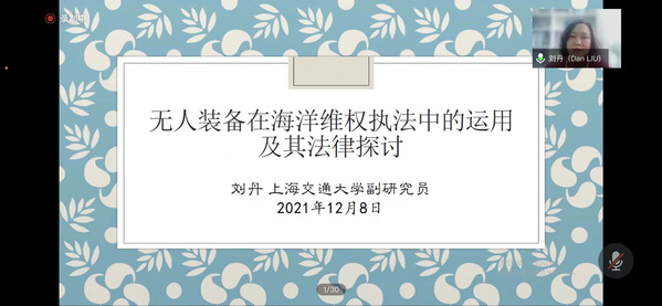 议题二的第四位发言人上海交通大学凯原法学院刘丹副研究员发言的主题是《无人装备在海洋维权执法中的运用及其法律探讨》。刘丹老师从无人装备的类型与应用、无人海洋装备(UMS)对《海洋法公约》的挑战、无人海洋装备运用对我国维权执法产生的影响三个部分进行讲述。刘丹介绍了什么是无人海洋系统及不同类型无人机的具体应用,之后提出了目前关于无人设备的存疑、无人船对IMO项下及海洋法的挑战,以及无人机运用于海洋维权执法中的问题等。最后,刘丹总结了无人装备在未来海洋维权执法实践中的重要性。
