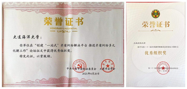 近日,由大连市委政法委、大连市法学会共同举办的“创建‘一站式’矛盾纠纷解决平台 推进矛盾纠纷多元化解工作”论坛征文活动通报了评选结果。经论坛评审委员会评审,我校海洋法律与人文学院获奖论文9篇,其中一等奖1篇、二等奖2篇、三等奖1篇、优秀奖5篇。同时,我校荣获优秀组织奖。