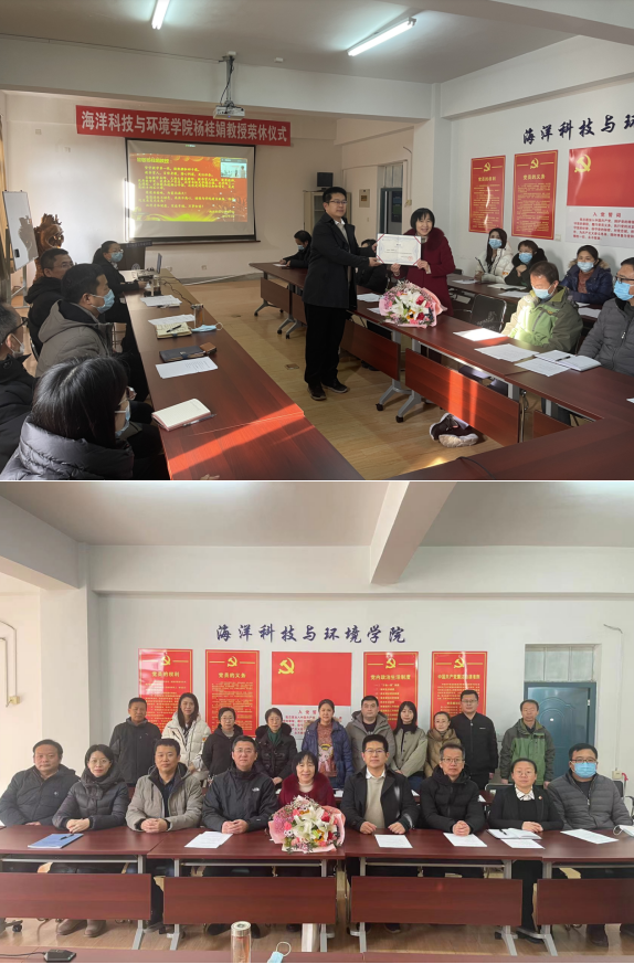 1月5日上午,海洋科技与环境学院在会议室305隆重举行杨桂娟教授荣休仪式。学院领导班子、各专业负责人、教研室(实验室)主任、行政教辅等相关人员线下参会,其他教职工线上参会。仪式由党总支书记关呈俊主持。