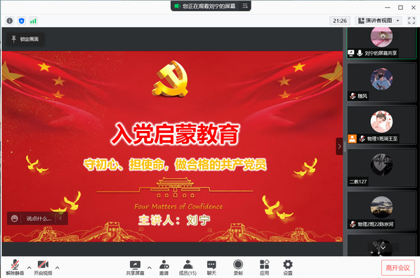 为切实做好入党启蒙教育工作,引导学生积极向党组织靠拢,激发爱党爱国热情,端正入党动机,3月3日,海洋科技与环境学院组织线上召开2021级学生入党启蒙教育大会。会议由学院党总支副书记刘宁主讲,辅导员吴月阳和2021级全体同学参加此次大会。