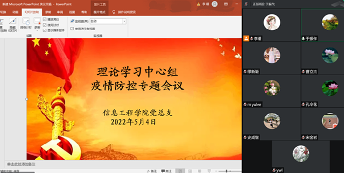 5月4日上午,信息工程学院理论学习中心组在腾讯会议召开了信息工程学院党总支理论学习中心组疫情防控专题学习会议,深入学习贯彻习近平总书记关于疫情防控的重要论述。会议由党总支书记于振作主持。