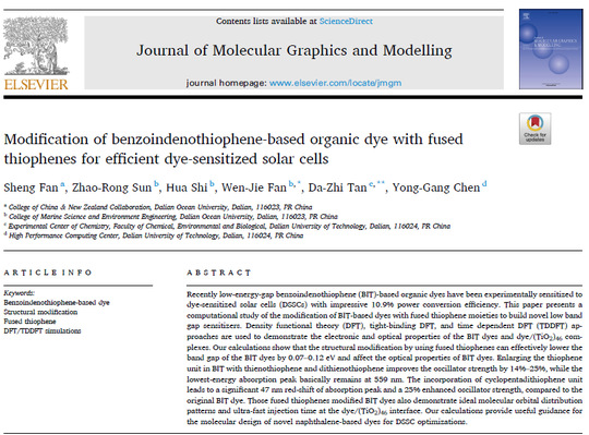 近日,机械与动力工程学院(中新合作学院)2019级中新合作办学项目学生樊晟作为第一作者的研究论文Modification of benzoindenothiophene-based organic dye with fused thiophenes for efficient dye-sensitized solar cells在线发表于Journal of Molecular Graphics and Modelling期刊。