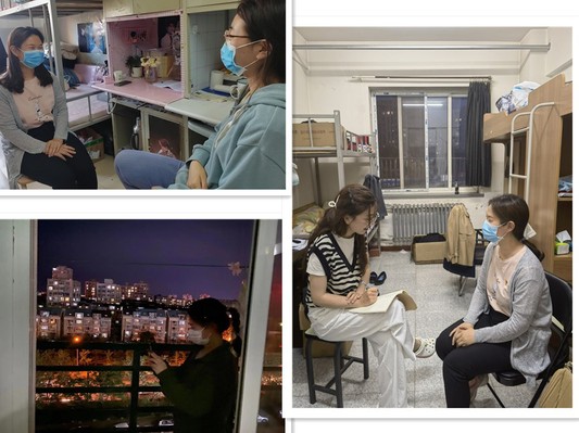 大学生公寓管理区是我校师生最多,各方面情况都最复杂的管理区,驻守在管理区的李冬老师要负责5000多名师生的心理健康工作。驻校之后,李冬老师与各院辅导员进行了交流,了解了当前有心理问题的学生的情况,并与学生进行了面对面的交流。学生中有人际关系问题的,有对未来发展迷茫的,有对当前封闭管理产生情绪的,经过咨询,学生的情绪得到了平复,状态得到了调整。在工作之余,李冬最为挂念家中3岁的女儿,每次视频时孩子都会问妈妈你什么时候回来,每次都以转移话题结束,或者女儿自言自语的说当我大声喊妈妈名字的时候,妈妈就会回来了......李冬老师说,想到女儿就会有内疚、自责,但是驻校就需要承担自己的责任,咬紧牙关坚持到底,保证学生的安全、健康,一切都是值得的。