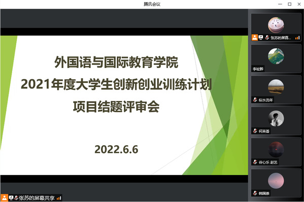 6月6日,外国语与国际教育学院在腾讯会议线上召开2021年度大学生创新创业训练计划项目结题评审会。学院领导班子成员、教研室主任和副主任组成的学院创新创业训练计划项目评审组对课题进行了评议和指导。