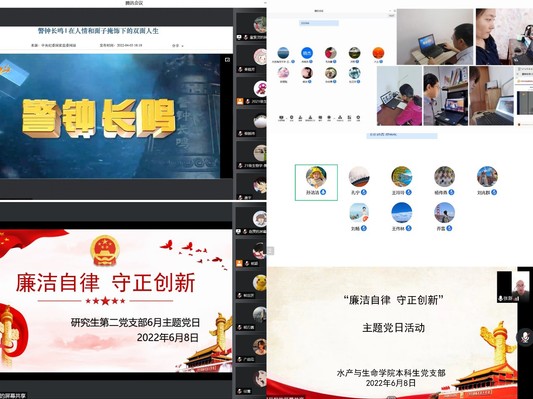 6月8日,水产与生命学院党总支组织学院各党支部在线上开展了6月份“廉洁自律 守正创新”主题党日活动,学院全体党员参加。