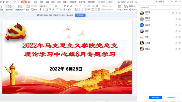 6月28日,马克思主义学院党总支以腾讯会议形式召开了本年度6月份理论学习中心组专题学习会议,学院党总支理论学习中心组成员参加会议。会议由学院党总支书记邱金英主持。
