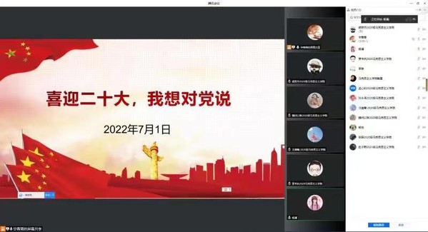 7月1日,马克思主义学院研究生党支部通过腾讯会议线上开展了“迎七一·我想对党说·重温入党誓词”主题党日活动,支部全体党员参加。