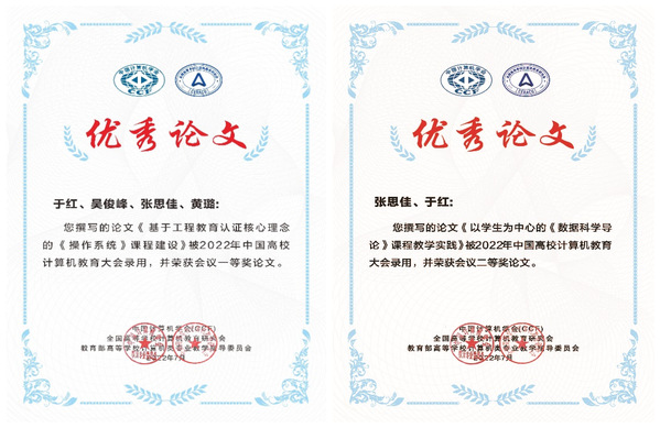 近日,由中国计算机学会(CCF)、全国高等学校计算机教育研究会、教育部高等学校计算机类专业教学指导委员会联合主办,由中山大学、CCF教育专业委员会承办的2022年中国高校计算机教育大会顺利落下帷幕。信息工程学院于红教授等4名教师撰写的论文“基于工程教育认证核心理念的《操作系统》课程建设”荣获一等奖论文;张思佳等两名教师撰写的论文“以学生为中心的《数据科学导论》课程教学实践”荣获二等奖论文。