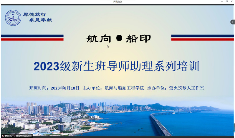 为进一步践行“红绿蓝”育人理念,加强并完善学生干部队伍建设,锻炼提升学生干部队伍分析、解决问题等综合能力,保障学院学生服务管理工作机制良性运行,近日,航海与船舶工程学院于腾讯会议举行2023级新生班导师助理开班仪式暨第一次培训,学院党委书记王海鹏、党委副书记陈禹娜、各年级辅导员及2023级新生班导师助理参会。
