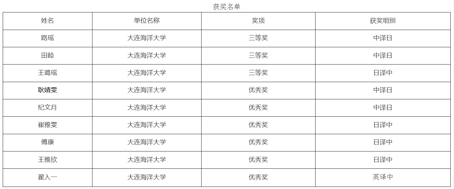 近日,第四届“海洋杯”国际翻译大赛获奖结果公布。大赛设立英语、日语、韩语3个语种的笔译竞赛项目。来自全球260家院校及企事业单位,共计2531人次报名参赛。我校学子在此次激烈角逐中取得优异成绩,共计获得三等奖3项、优秀奖6项。