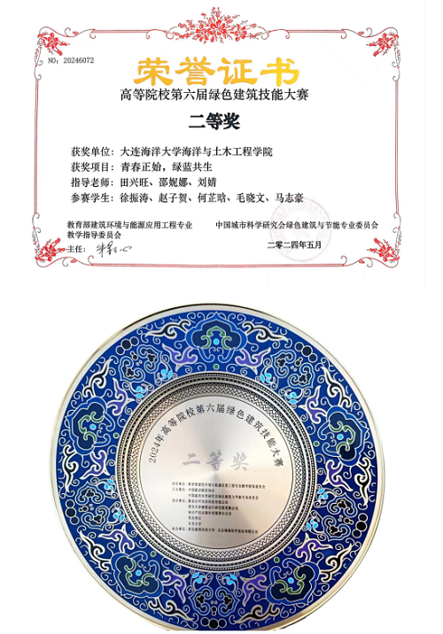 近日,第六届全国高等院校绿色建筑技能大赛决赛在西安建筑科技大学落下帷幕。此次比赛中,全国B赛道仅8支队伍荣获二等奖,经过激烈的角逐,我校海洋与土木工程学院田兴旺、邵妮娜、刘婧三位老师指导的研究生团队(徐振涛、赵子贺、何芷晗、马志豪、毛晓文)的作品--《青春正始,绿蓝共生》,喜获全国二等奖。