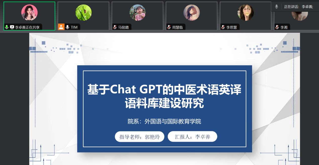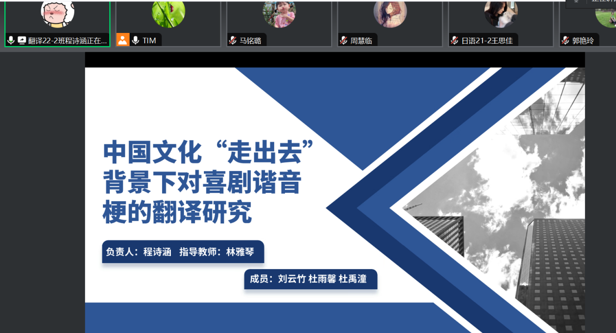 各项目组负责人分别从项目背景、研究意义、研究内容拟解决关键问题和创新特色等方面逐一进行了陈述。学院共申报21项大创项目,涉及非遗文化保护、乡村振兴、ChatGPT、民族旅游、语料库建设、流行语翻译等选题,各项目组紧跟时代前沿和热点话题。经过学院教指委评委打分,最后评选出国家级项目1项;省级项目2项;校级A项目10项;校级B项目8项。