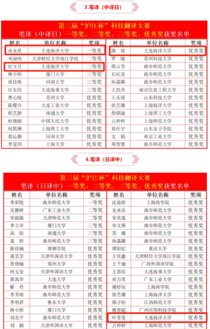 6月28日,第三届“沪江杯”科技翻译大赛结果公布。本次大赛有来自全球285家院校及企事业单位,共计2261人次报名参赛。我校共4名学生获得不同奖项,其中由日语教师王国华指导的日语笔译2022级研究生高永星获得中译日组最高奖(一等奖,第1名);崔松子老师指导的日语笔译2022级研究生纪文月获得同组二等奖(第3名),刷新我校在该项赛事的历史最好纪录;张红艳老师指导的学生路瑶与黄桂峰老师指导的学生叶莹莹获得优秀奖。