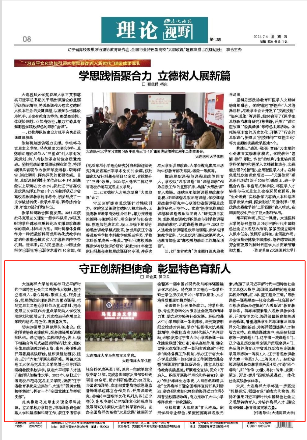 7月4日,《辽沈晚报》在A08版以《守正创新担使命 彰显特色育新人》为题报道我校马克思主义学院建设情况。