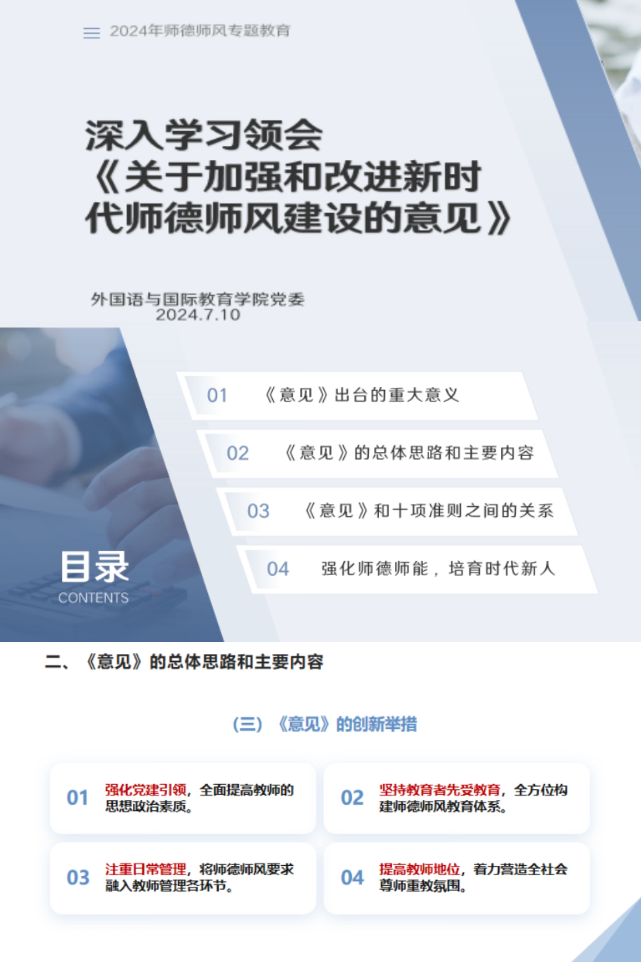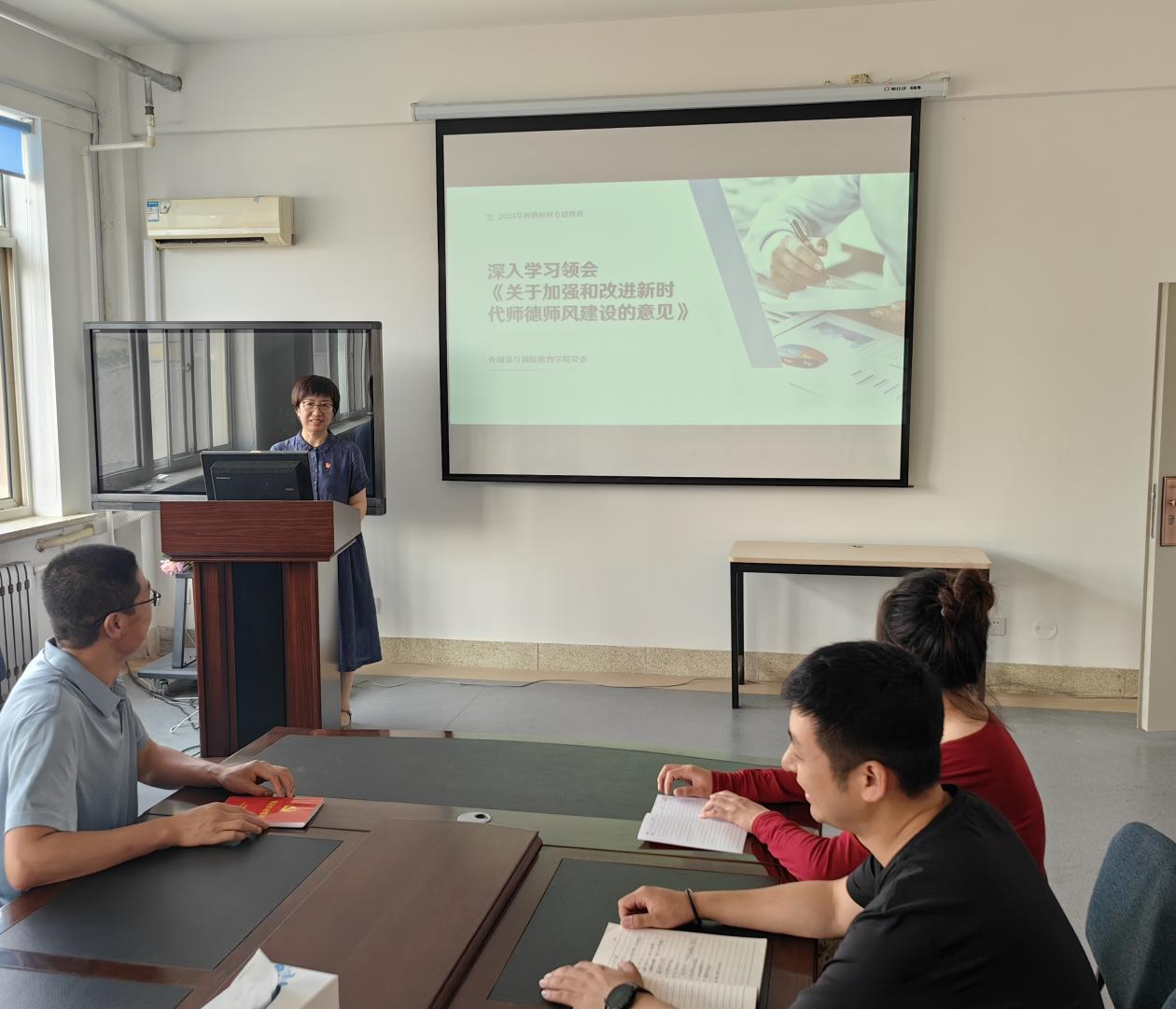 为深入推进师德专题教育,7月10日,外国语与国际教育学院党委书记邓艺、院长郭艳玲、副院长王倩、副院长崔永光分别在教师党支部讲授了“深入学习领会《关于加强和改进新时代师德师风建设的意见》”主题党课。