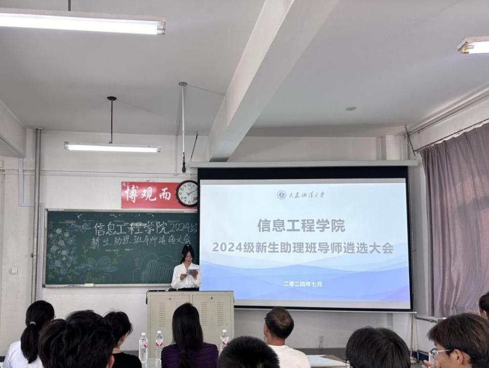 为进一步加强大学生思想政治教育,全面做好2024级新生入学日常教育管理与服务工作,协助辅导员、班导师进行新生思想教育、行为引导、学习指导,促进新生全面、健康、和谐发展。7月10日,信息工程学院在大黑石校区二教402举办了2024级新生助理班导师遴选大会。本次大会由熊一嘉主持,学院党委副书记范庆华、团委书记修恒哲、各年级辅导员以及新生助理班导师候选人参加本次大会。