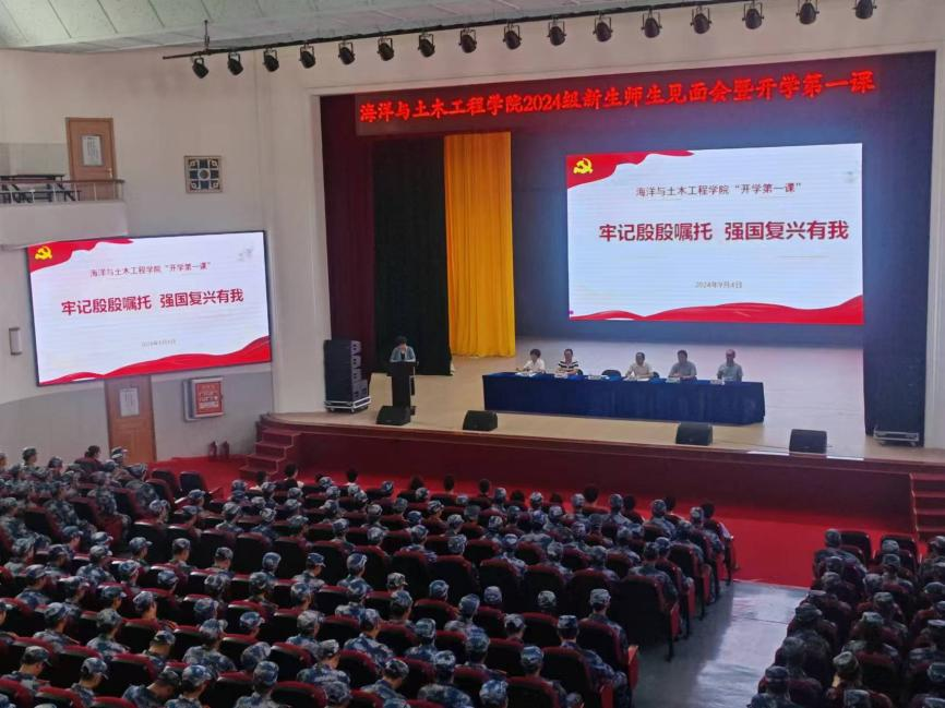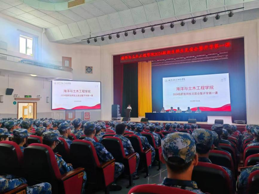近日,海洋与土木工程学院2024级师生见面会暨“开学第一课”活动在黑石礁校区俱乐部隆重举行。学院党委书记邓艺、院长陈昌平、副院长张殿光、郑艳娜、学院党委副书记谭利娟、纪委书记张琨以及各教研室主任、新生班导师、辅导员以及学院2024级340名本科生参加会议。会议由谭利娟主持。