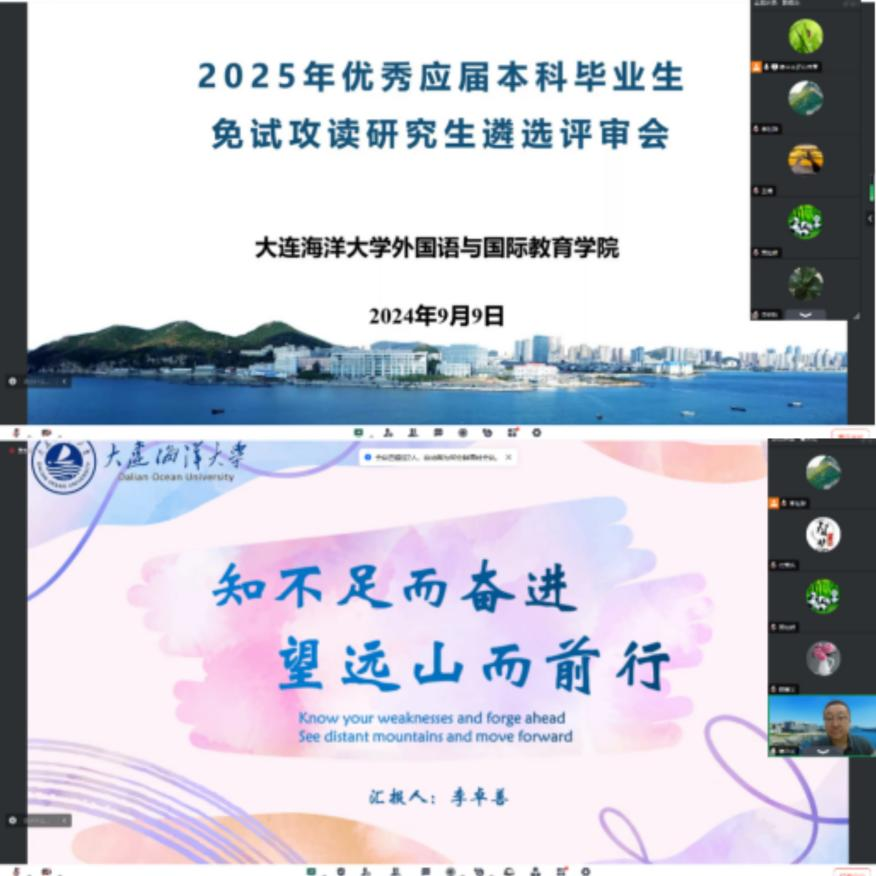 按照《大连海洋大学推荐优秀应届本科毕业生免试攻读研究生遴选工作办法》和《关于做好2025年推荐优秀应届本科毕业生免试攻读研究生遴选工作的通知》要求,学院制定了推免工作实施细则,成立推免生遴选工作领导小组。按照程序要求,对照推荐条件严格审查申请人的推荐资格。评审会上,领导小组首先召开会议,明确遴选工作程序、严明评审纪律要求。英日语专业10名申请人从个人情况、学业成绩、创业竞赛、现实表现等方面进行了陈述与展示。最后,评委按照学生的现实表现进行现场打分。