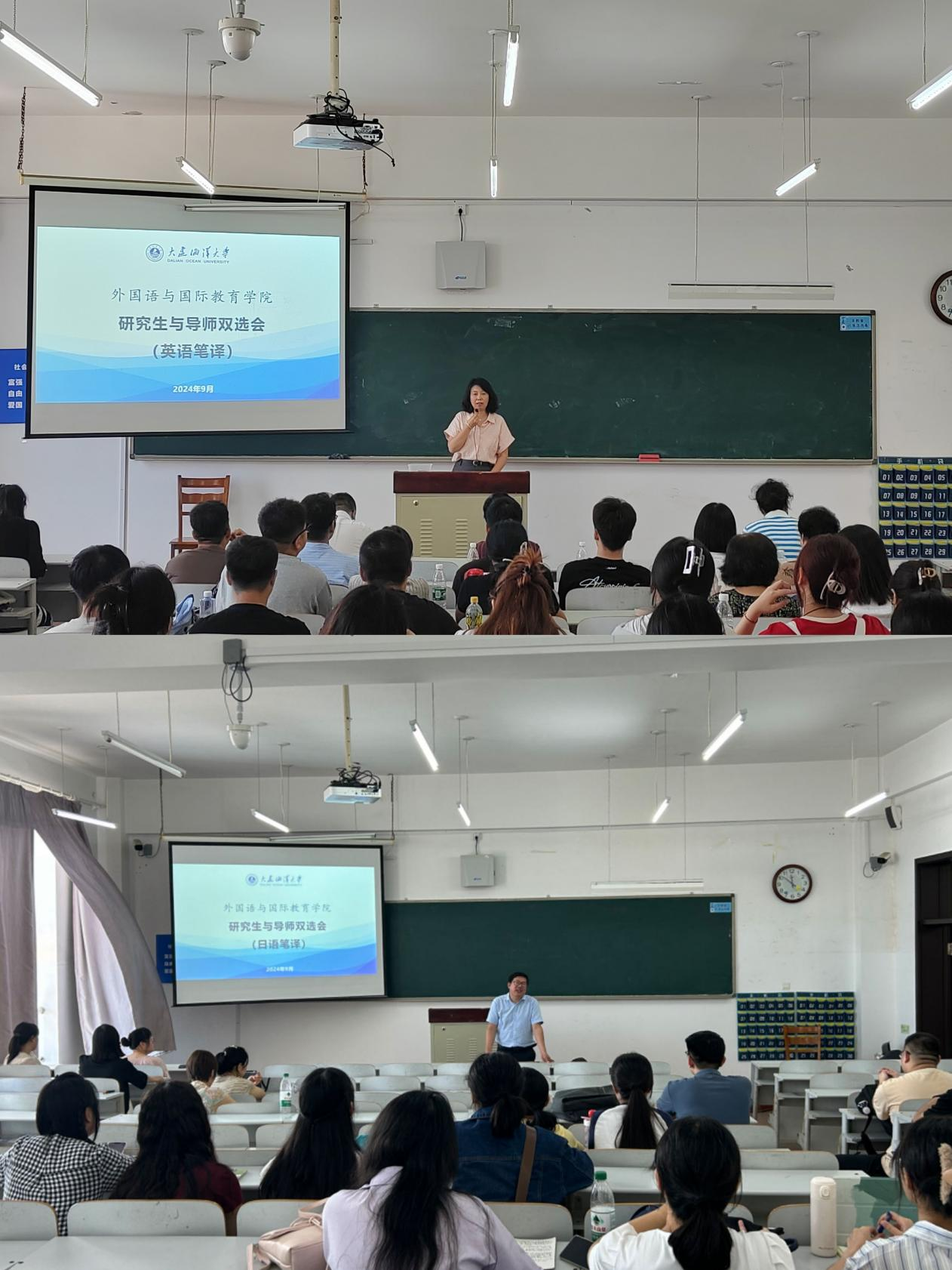 近日,外国语与国际教育学院分别于獐子岛教学楼323与327教室开展了英、日语笔译专业的研究生新生与导师的双选会。学院研究生导师、2024级全体研究生参加会议。会议分别由学院副院长王倩、纪委书记黄桂峰主持。